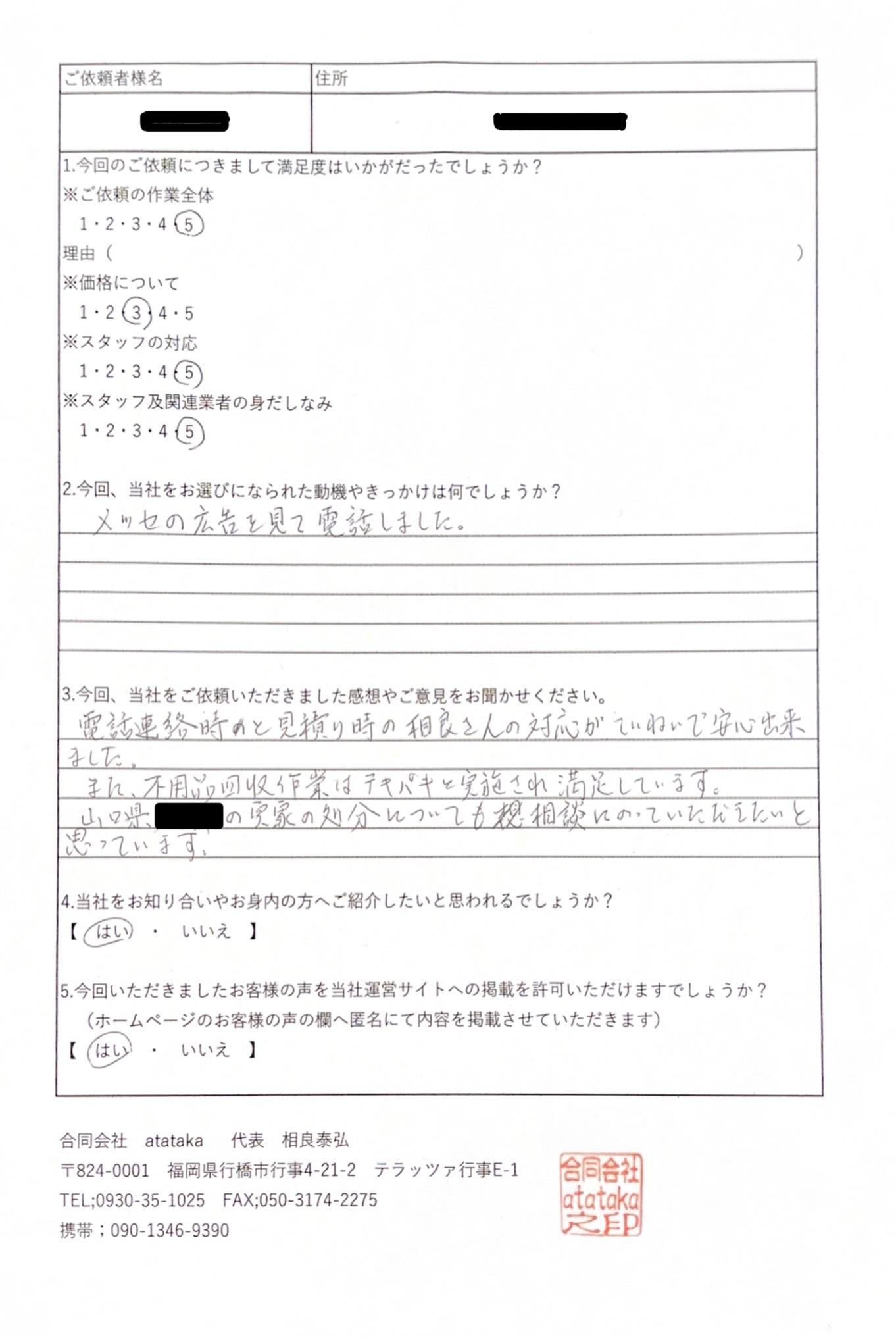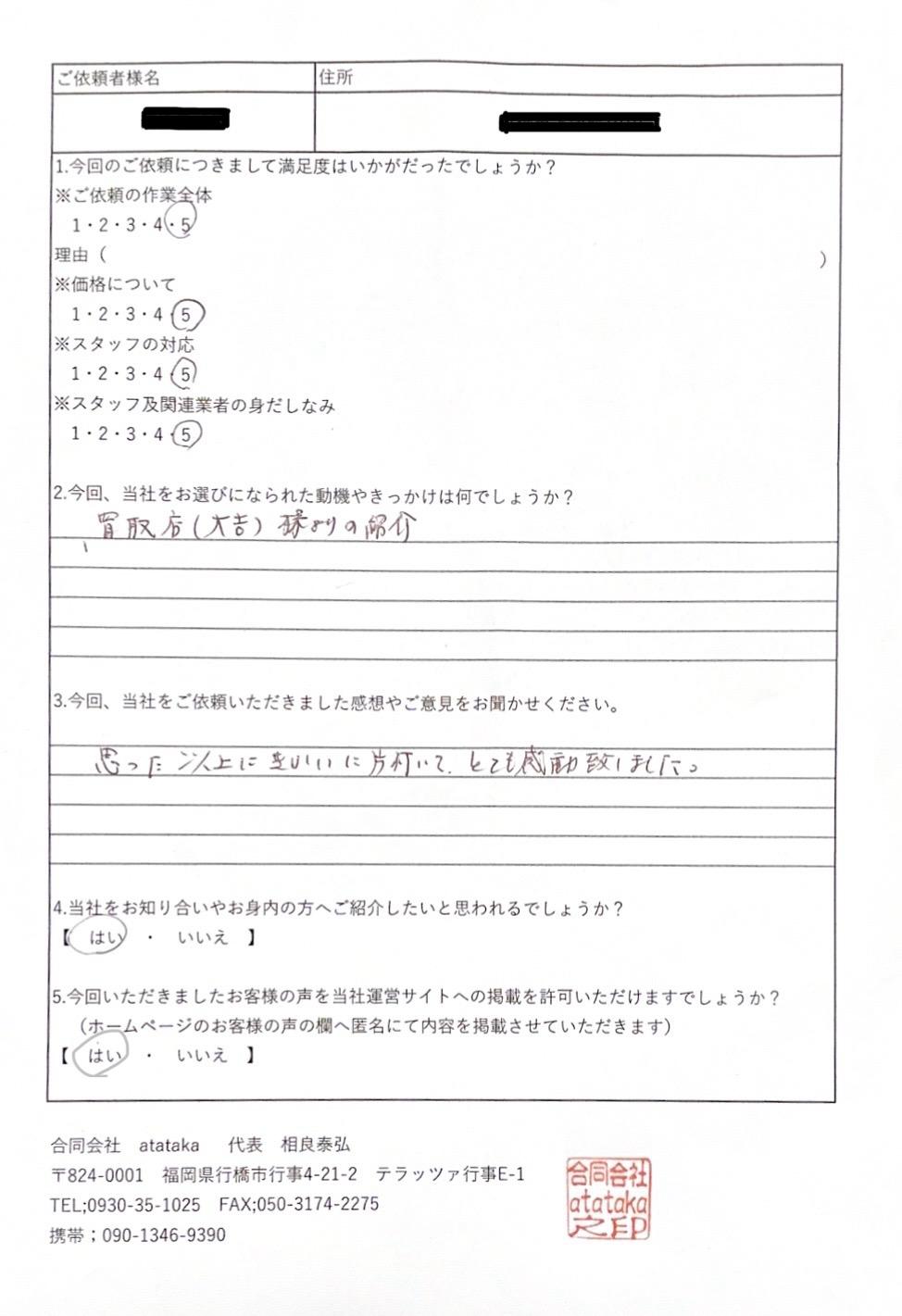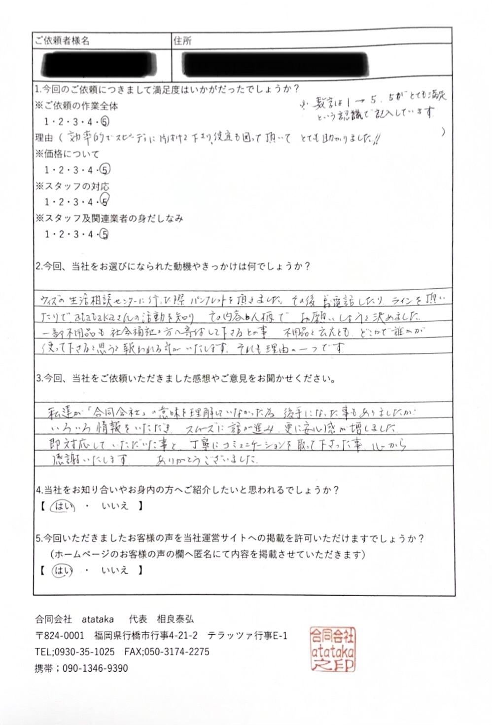 北九州市の某マンションにて行いました生前整理のお客様からのアンケートが届きました。ありがたいお言葉をいただきました。綺麗な元の状態に戻ったお部屋を見られてびっくりされていました。お知り合いで生前整理等があれば紹介するね!とまで言っていただきました。今後の励みになります。T様この度はご依頼いただきありがとうございました。